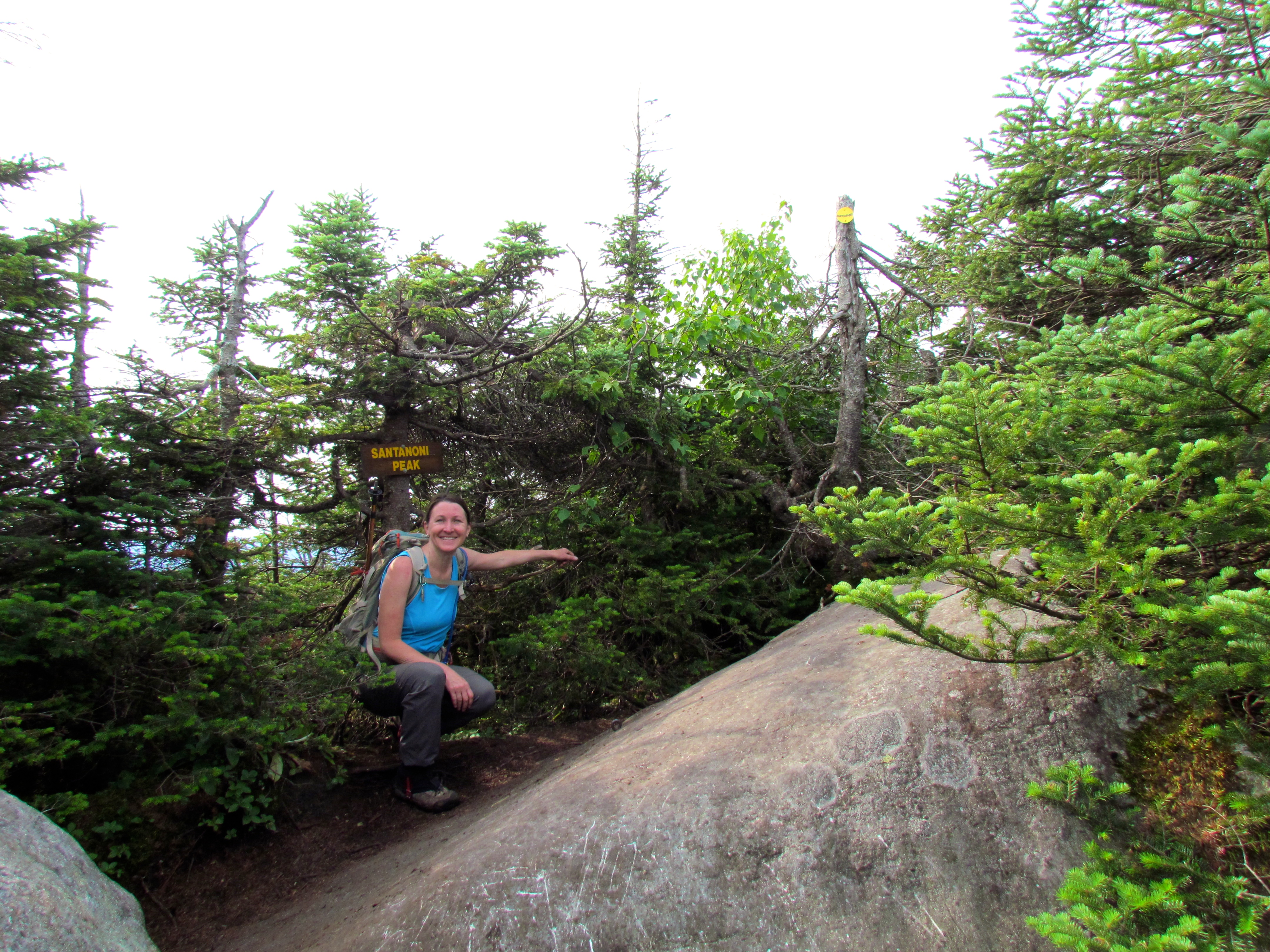 Past the ridge, we arrived at a large rock outcropping, and to our surprise, we saw the familiar signpost with yellow letters announcing Santanoni Peak.