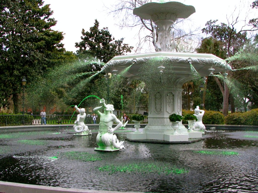 The Forsyth fountain befittingly turned green for St. Patrick’s Day – Savannah, Georgia!